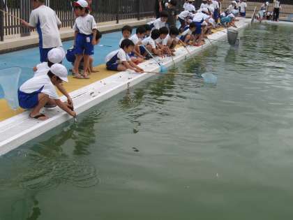 3校時には雨もやんだので,大よろこびでプールへ行き,魚とりあみを上手につかって虫とりに夢中になりました。