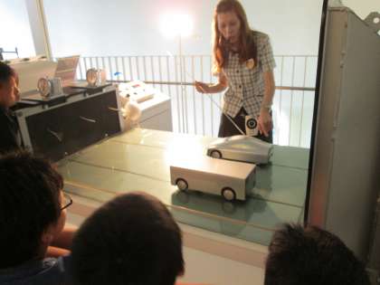 「えっ!?車って3万個の部品からできてるん!!」とても驚いた様子で聞いている子ども達。その3万個の部品が,全て並べてあるのを数えようと「1,2,3,4……数えられへんし!」と一生懸命数えていました。