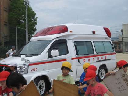 25日に火事の避難訓練がありました。1年生の子どもたちは,「おはしもて」をよく守り,上手に避難することができました。そして,めったに見ることができない放水訓練を見せていただきました。太いホースがふくらんでいき,ホースの先から勢いよく水が噴き出す様子を見て,子どもたちは,歓声をあげていました。その後,救急車や消防車を囲んで,絵を描きました。実物を前にして迫力のある絵が描けました。