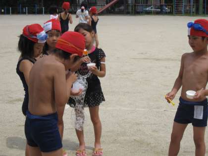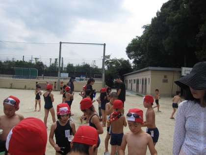 プールに入る前に,水着姿でシャボン玉あそびを楽しみました。たくさんのシャボン玉が虹色に光る中,子どもたちの歓声があがっていました。