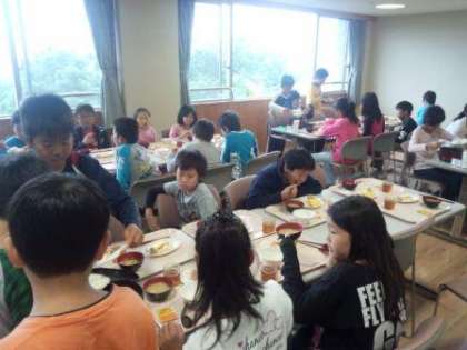 写真は,朝食を食べている様子と,食事を終えて食器の返却をグループで協力して行っているところです。もう1枚は,自然保護センターに到着し,「自然観察」の前に職員さんからお話しを聞かせていただいているところです。めずらしい植物もたくさん咲いているので,子どもたちは楽しみにしているようです。