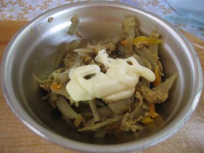 さとう・しょうゆ・カレー粉で味付けしていますが,子供達がお好みで各自の食器の中でマヨネーズで調味してサンドを仕上げていきます。