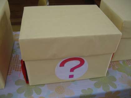 ?(はてな)ボックスに4種類のおいもを入れておきました。クイズ形式で一人の子供に手をボックスに入れてもらっておいもの大きさ・形・触った時の匂いなどのヒントを他の友達に教えていきました。