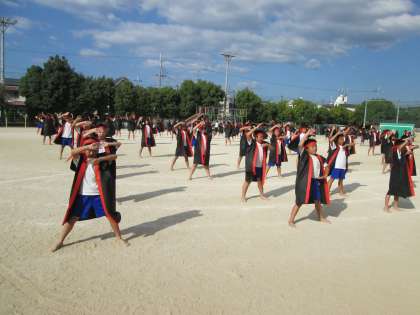 運動会の当日に着る衣装を着ておどりました。新しい衣装に袖を通したり,ハチマキを友達と協力しながら巻いたりしてとてもうれしそうにしていました。子ども達の動きも心なしか軽くなり,腰を落とししっかり声を出していました。