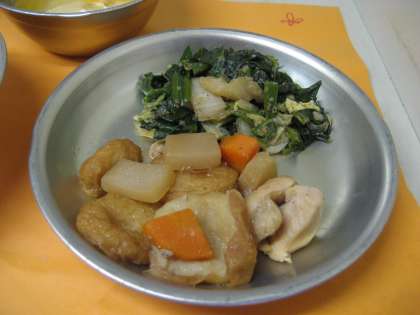 給食室から応援の気持ちを込めて応援こんにゃくを平天とこんにゃくの煮つけの中に入れました。
