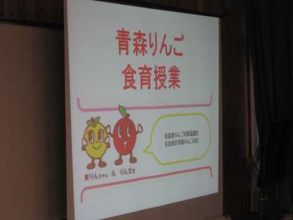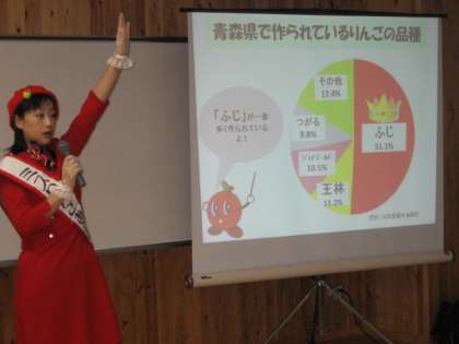 はじめに,ミスりんごさんが青森県の日本及び世界のりんご集荷量やりんごの種類についてお話してくださいました。