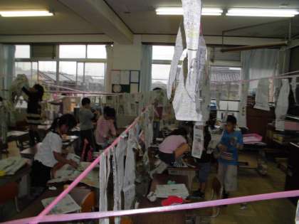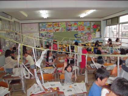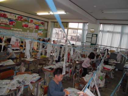 上につるしてあるヒモや,教室の机やいすなどにつないでいきました。