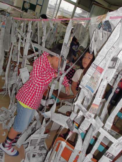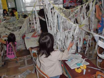 熱心に新聞紙を使って取り組み,教室がくもの巣のようになりました。