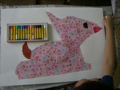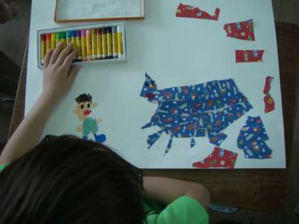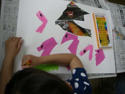 広告や色紙などの紙をちぎって,何に見えるかを想像して,絵にしました。