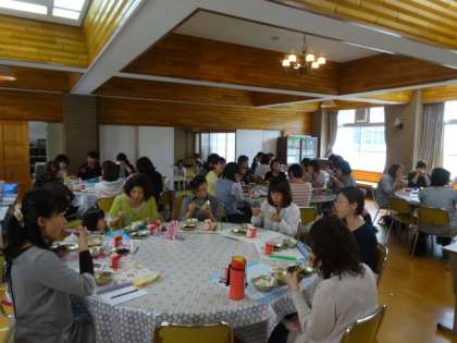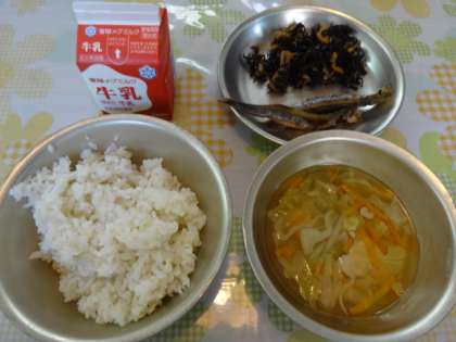 実際に給食(麦ごはん,牛乳,ししゃものからあげ,ひじきの煮つけ,キャベツの吉野汁)を試食していただき,「おいしかった」「お家でもだしをとってみたい」「意外と薄味だった」などいろんな感想をお聞きすることができました。