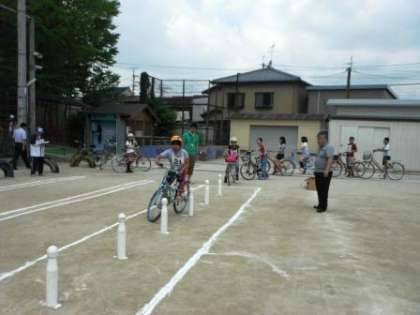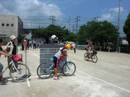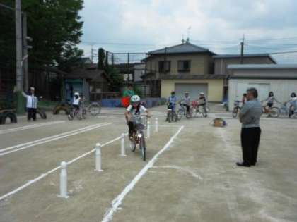 6月14日(土)「土曜学習」として,「自転車安全教室」を本校の運動場で行いました。とても良い天気の下,向日町警察署の交通課の方をはじめとして,学校運営協議会を中心に乙訓交通安全協会・交通安全協議会・自主防災・少年補導・消防団・体育振興会・PTAの方々にお手伝い頂きながら,行うことができました。子どもたちは警察官等の言われることを熱心に聴き,実践しようとする姿が見られました。