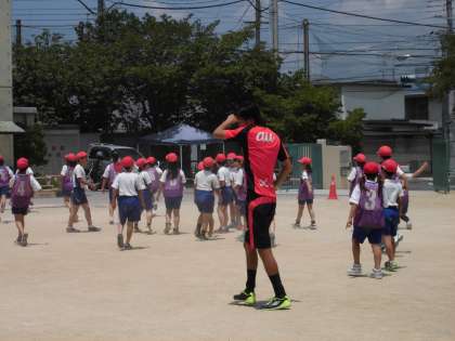 クラスごとに分かれて,選手の方と一緒にゲームをしました。広いコートを走り回って,楽しくゲームをすることができました。サッカー教室の後には,教室で一緒に給食も食べてくださり,プレゼントやサインをもらって大満足の様子でした。