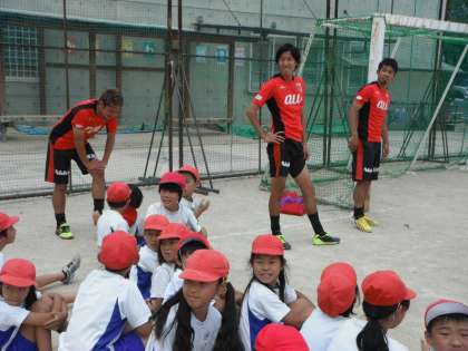 6月24日(火)3・4校時に,本校の4年生が「京都サンガフットボールアカデミー」の学習をしました。京都パープルサンガから山瀬功治選手,比嘉祐介選手,黄大城選手と,女性の指導スタッフの方を含めて4名の方から「サッカーの楽しさについて」いろいろとご指導いただきました。子どもたちは,テレビ中継などでしか見たことのない本物の選手に直接関わる機会ができて,本当に生き生きと楽しんで取り組んでいました。また選手の皆様も本当にフレンドリーな対応をしていただき,最後には給食まで子どもたちと一緒に食べる機会を作っていただいて,子どもたちにとっては心に残る思い出がまた一つできたようでした。サンガの関係者の皆様,本当にありがとうございました。