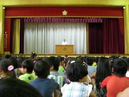 左は夏休み前の朝会の様子です。