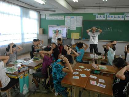 夏休み明けから新しいALTの先生が,高学年の児童に英会話を教えてくださっています。今日は,5年生の授業を見せていただきました。子どもたちは,先生の発音をしっかり聴いて,真似をしながら練習していました。また,カードを使ったゲームや,英語を聴いて応える学習も楽しみながら行っていました。