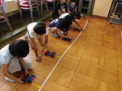 今日は,ゴムをのばす長さをかえると車が動く距離がどうなるのかを調べました。