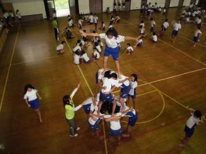 6人技のドラゴンタワーに苦戦しているグループや,3段タワーがなかなか立たないグループなど,お互いに声を掛け合い練習しています。
