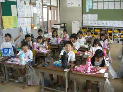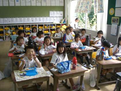子どもたちは笑顔で,お弁当のおにぎりやおかずをほおばっていました。