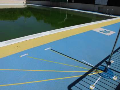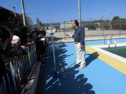 プールサイドで,太陽の動きを9時から3時まで1時間おきに調べました。