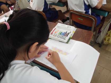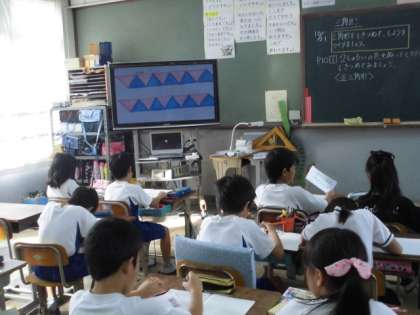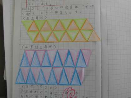 正三角形と二等辺三角形に色をぬり,しきつめました。