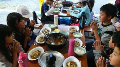 野外炊事では,すきやき風煮を作りました。