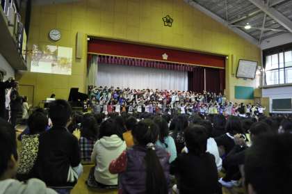 体育館に全校児童が集まって,2年生の発表を聞きました。
