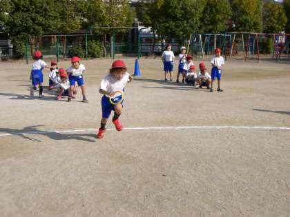 バトンや玉をもって走り,お友達に早くパスできるように考えました。