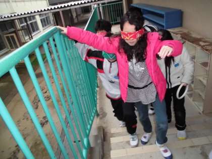 総合の学習でアイマスク体験をしました。目の不自由な人の立場に立ち,小さな段差や階段,障害物などを歩きました。