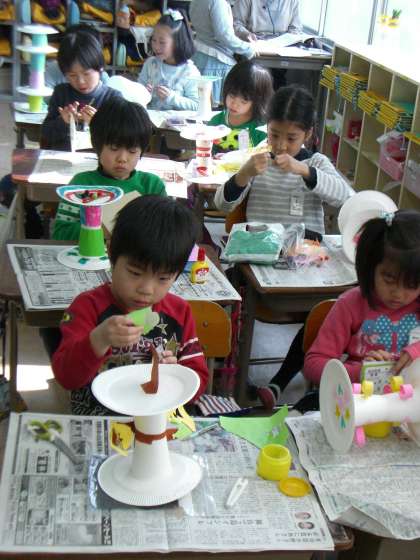 動く仕組みを生かして,毛糸や折り紙の紐をつけたり,