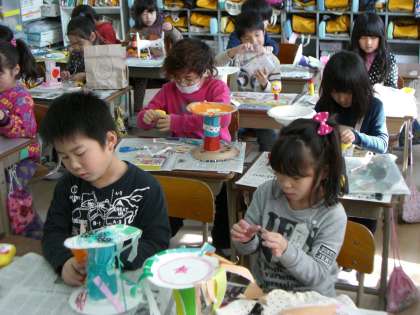 図工科の「コロコロ ゆらゆら」では紙コップと紙皿で動く仕組みをつくり,