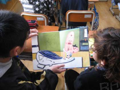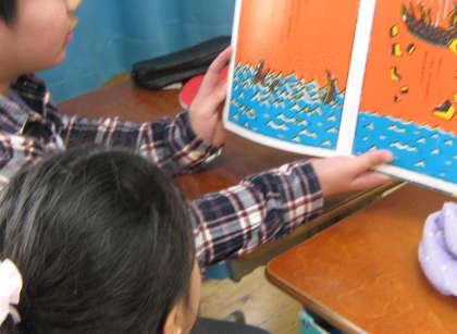 お兄さん,お姉さんの顔になり,絵本を1年生に傾けながら読んでいました。