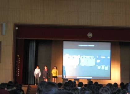 中学校の生徒会のみなさんが,劇や,スライドなどを使って,中学校のきまりや,クラブなどを紹介してくれました。みんなは興味深々でした。