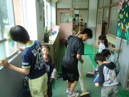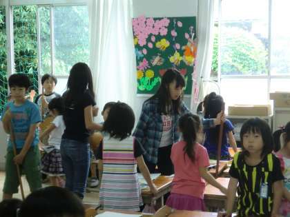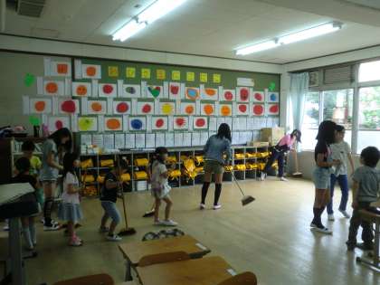 掃除時間に,それぞれのたてわりクラスの1年生の教室へ行って,お手伝いをしています。6年生が1年生に掃除の仕方を手取り足取り教えている姿は,とても微笑ましいです。いろいろな場面を通して,やさしい子どもたちに育っていってほしいです。