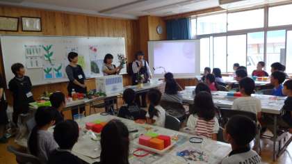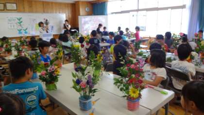 花育活動で,フラワーアレンジメントを行いました。行事にもさまざまな植物が使われていることを,紙芝居でとても分かりやすく教えていただきました。たくさん用意して頂いた花の中から,子どもたちは思い思いに,気に入った花を4本選び,バランスを考えながら素敵な作品を仕上げることができました。