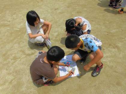 運動場で太陽の光を光電池に当てて,電流の大きさを計測しました。