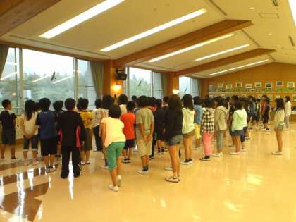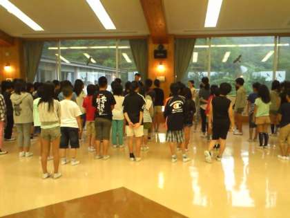 今日もこちらは朝から雨が降っていますが,午前中の「大野市内の見学」は,十分に気をつけて行いたいと思います。写真は,朝のつどいを行っている様子です。