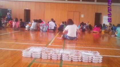 大野市内スタンプラリーは、何とか無事に終わりそうです。心配された雨も、だいぶ小雨になり、子どもたちは、予定の時刻よりも早めに、昼食場所である結ステーションの多目的ホールに集まってきました。