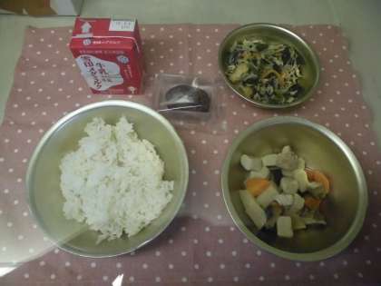 9月7日(月)の給食は,麦ごはん,牛乳,高野どうふのたき合せ,もやしの煮びたし,おはぎでした。
