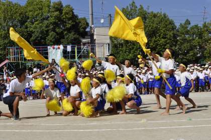 応援合戦,赤組と黄組も頑張りました。応援団と応援席の児童が心を1つにしてパフォーマスンスを披露しました。