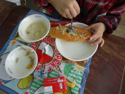 ツナごぼうサンドは,教室でマヨネーズをかけてからパンにはさんで食べます。子どもたちは上手にパンをに割って大きな口でほおばって食べていました。