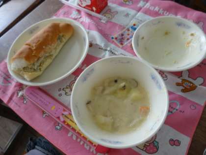 きのこのクリームシチューには,しめじとエリンギを使いました。手作りのホワイトルーと一緒にじっくり煮込まれておいしく仕上がりました。きのこが苦手な子も頑張って食べました。