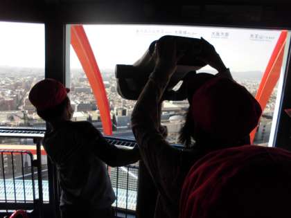 京都タワーの展望台からの景色に,「車や新幹線が見える!」,「建物が小さいね」と大興奮の様子。