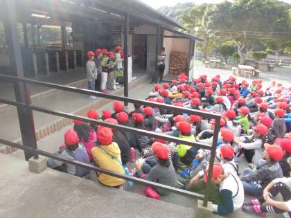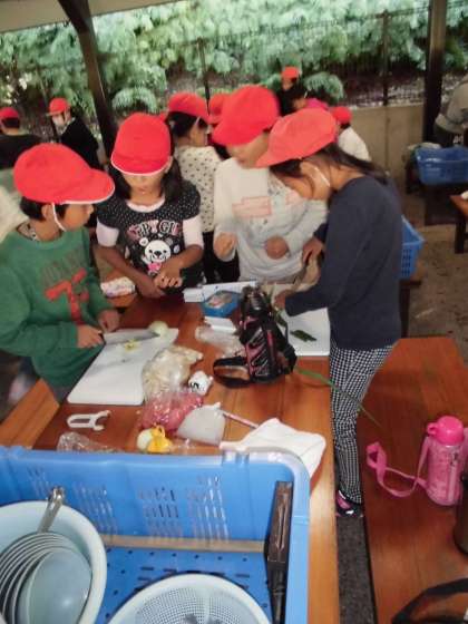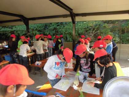 食事係りから,野外炊事の手順を聞き,その後グループで協力して,すきやき風煮込みを作りました。