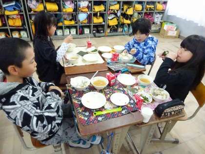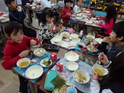 2月3日の給食は,楽しみにしていた手巻き寿司でした。「南南東ってどっち?」と言った声や「今日は夜ごはんは恵方巻きだ」などと言った声もあがり,みんなで節分に親しみました。いり豆もおいしく頂きました。
