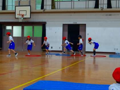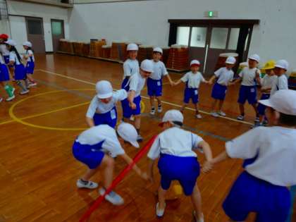 体育で「体ほぐしの運動」の学習をしました。手をつないだまま,フラフープを渡したり,先頭の友達のまねっこをしたり,子ども達は楽しみながら,学習に取り組んでいました。