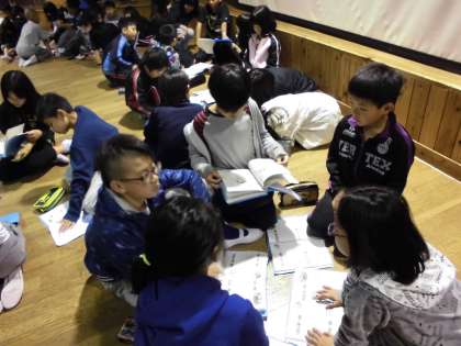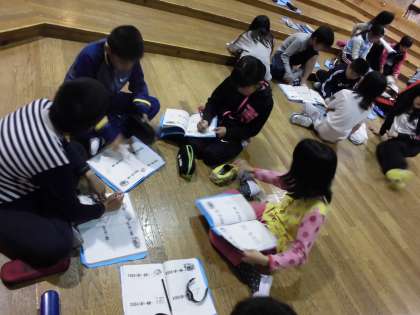 一日の様子を振り返っています。よかった点,改善したい点をきちんと話合い,明日からの活動に生かそうと一生懸命でした。自分で考え,行動できるたくましい5年生の姿が見られました。