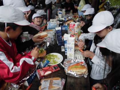 小雨の中,野外炊事場へ到着。説明を聞いた後,いよいよ開始です。おいしくできるか楽しみです。