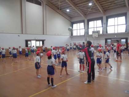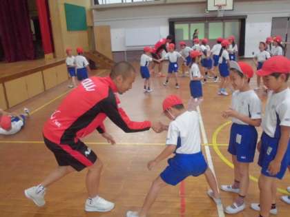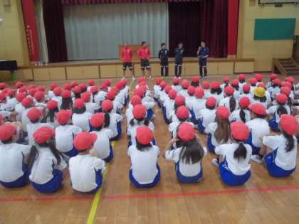 11日(水)3・4時間目に京都サンガの選手,コーチの方々に来ていただきました。体育館で手押し相撲や,ボール運動を通して,力の入れ方や空間認知の感覚などを楽しく学習しました。