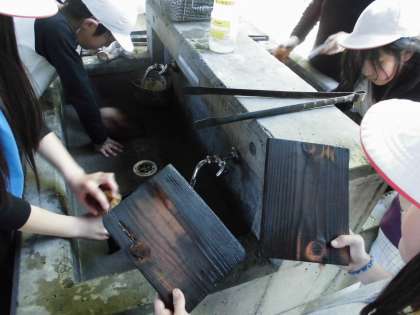 かまどの火で焼き板作りをしました。こすって思い出の品もできました!学校で絵付けなどをする予定です。