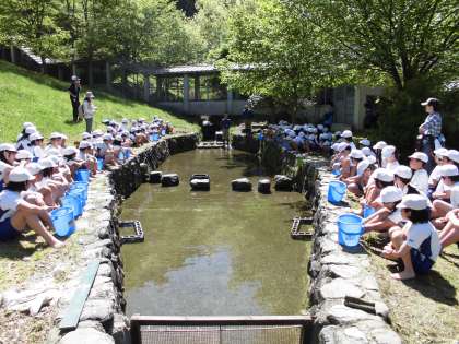 準備ができました。施設の中にある川で魚つかみです。さて,上手につかめるでしょうか!!?